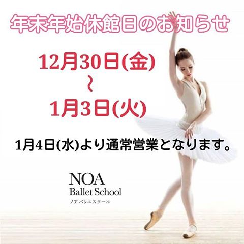 12.08Thu / 2016 年末年始休館日のお知らせ 今年も残すところ一ヶ月!早いですね(。´д`。) 本日は皆様に、年末年始の営業日のお知らせです。 12月29日(木)通常営業 12月30日(金)休館日 12月31日(土)休館日 1月1日(日)休館日 1月2日(月)休館日 1月3日(火)休館日 1月4日(水)通常営業 ノアバレエスクールは、全館12月30日(金)~1月1日(火)までがお休みとなります。 よろしくお願いいたします。 前のページに戻る SCHOOL スクール別のブログです。 新宿校 都立大校 池袋校 秋葉原校 恵比寿校 赤坂校 自由が丘校 御茶ノ水校 中野校 吉祥寺校