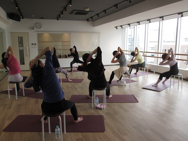 お写真はレッスンの前半で、75分レッスンの中で前半一時間程はイスに座った状態で、最後の15分はマットの上で身体を動かしていきます。