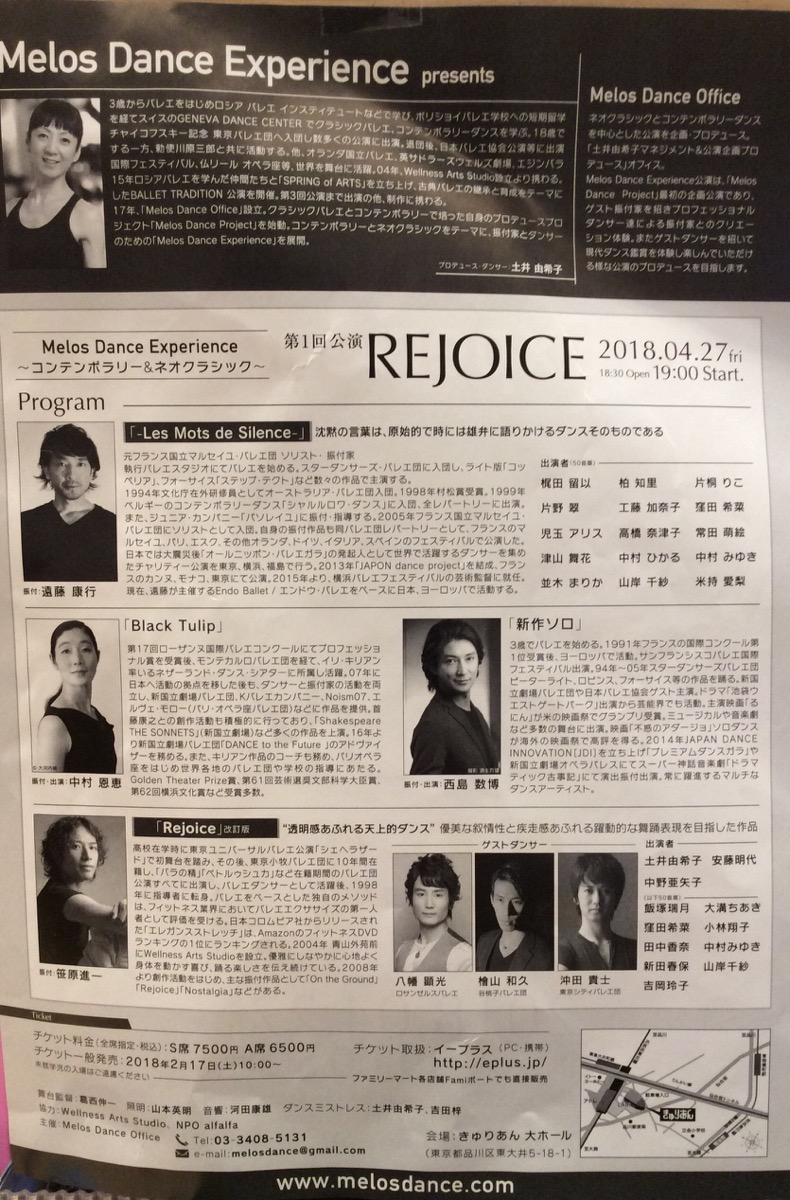 ネオクラシックとコンテンポラリーダンスを中心に、ゲスト振付家とプロフェッショナルダンサー達によるクリエーションをプロデュースするMelos Dance Experience。第一回公演「REJOICE」では、元フランス国立マルセイユ・バレエ団のソリスト遠藤康行と、笹原進一の振付作品を発表。また、スペシャルゲストに中村恩恵、西島数博を迎えて小品をお届けします。