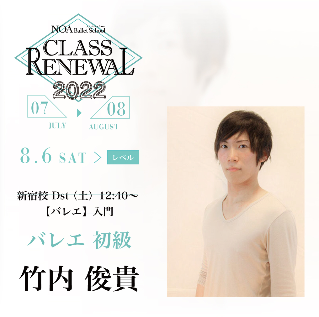 8月より竹内先生のレッスンが入門→初級に変更となります!